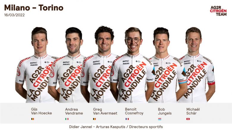 Milan-TurinLa formation AG2R Citroën se présentera avec plusieurs leaders au départ de Milan-Turin mercredi. Comme elle n'alignera pas de pur sprinteur, l'équipe française comptera sur ses puncheurs Greg Van Avermaet et Benoît Cosnefroy pour tenter de dynamiter la course, tandis que l'Italien Andrea Vendrame devrait se mêler à l'emballage final en cas d'arrivée groupée. Les autres coureurs sélectionnés sont Bob Jungels, Michael Schär et Gijs Van Hoecke.