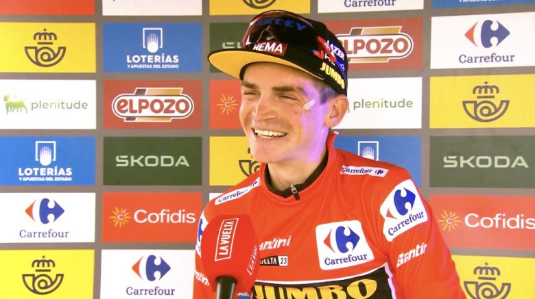 Tour d'EspagneSepp Kuss termine donc cette première semaine de La Vuelta avec le maillot rouge de leader ! Mais le grimpeur de la Jumbo-Visma n'a pas vécu une journée tranquille ce dimanche, la 9e étape ayant été grandement animée par le vent et les bordures. Toujours bien placé avec ses coéquipiers de la formation néerlandaise, l'Américain a dû se faire violence, lui qui préfère d'habitude courir en retrait, à l'arrière du peloton. Même si tout est rentré dans l'ordre ensuite, il restait encore l'arrivée au sommet du Collado de la Cruz de Caravaca à gérer, avec une route rendue délicate par des coulées de boue. Concédant finalement quelques secondes aux favoris sur la ligne fictive des 2 kms où les temps ont été arrêtés, Sepp Kuss était soulagé de s'en sortir indemne à la veille de la journée de repos.