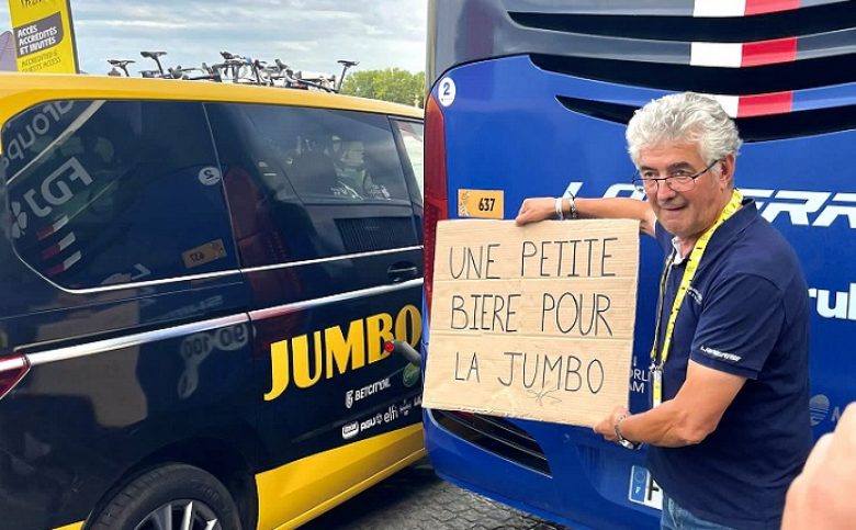 Tour de FranceQuelques jours après que Richard Plugge, le manager général de la Jumbo-Visma, a indiqué avoir vu des coureurs de la Groupama-FDJ boire de la bière à leur hôtel lundi lors de la seconde journée de repos du Tour de France, ce qui avait provoqué la colère de Marc Madiot - "Qu'il ferme bien sa gueule. C'est petit et minable", avait-il notamment lancé à l'encontre du Néerlandais suite à cette sortie médiatique - le Mayennais a chambré la formation batave dimanche soir après l'arrivée de la 21e étape. Très en forme, le patron de la Groupama-FDJ, bière à la main, a posé avec une pancarte sur laquelle était inscrit ce petit message : "Une petite bière pour la Jumbo". Sur une autre photo, Marc Madiot brandit cette pancarte juste à côté d'une voiture de la Jumbo-Visma. Ces deux photos ont été postées sur Twitter par Corentin Denolly, un joueur de tennis professionnel français. C'était du grand Marc Madiot dimanche soir !