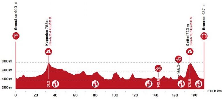 Tour de SuisseEst-ce qu'un sprinteur-puncheur, à l'image d'un Peter Sagan (Team TotalEnergies) ou d'un Michael Matthews (BikeExchange-Jayco), peut passer la côte de Sattel (3 km à 8,5% (max 9,2%)) ? Telle est la question. Située dans les 20 derniers kilomètres, cette montée permettra ainsi d'y voir clair sur le dénouement de cette 4e étape du Tour de Suisse entre Grenchen et Brunnen (190.8 km). Mais dans l'hypothèse où les sprinteurs n'arrivent pas à basculer avec le peloton, des coureurs comme Maximilian Schachmann (Bora-Hansgrohe) ou Tom Pidcock (INEOS Grenadiers) devraient être des prétendants crédibles à la victoire. Le succès d'un baroudeur n'est pas non plus à exclure ce mercredi. Enfin, Stephen Williams (Bahrain-Victorious) devra être à son meilleur niveau pour conserver sa tunique de leader.