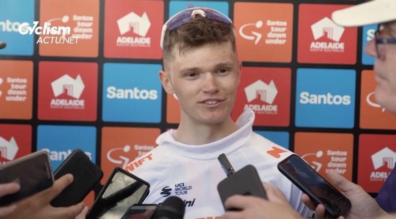Tour Down UnderLa jeunesse continue de se révéler sur cette édition du Santos Tour Down Under ! Après la première victoire professionnel d'Isaac Del Toro (UAE Team Emirates) cette semaine, c'est au tour d'Oscar Onley de lever les bras pour la toute première fois de sa jeune carrière, débutée l'an passé. A 21 ans, le prometteur Britannique du Team dsm-firmenich PostNL n'a pas fait les choses à moitié en débloquant son compteur sur l'étape reine d'une épreuve WorldTour, au sommet de la mythique montée de Willunga Hill, excusez du peu ! Plus fort dans le sprint final que Stephen Williams (Israel-Premier Tech) et Jhonatan Narvaez (INEOS Grenadiers), celui qui en profite pour grimper à la 2e place du classement général - à égalité avec son compatriote Williams - était évidemment ravi après l'arrivée. "Willunga Hill est une ascension assez emblématique donc avoir mon nom sur la liste des gagnants est vraiment cool et spécial", a-t-il commencé par dire.
