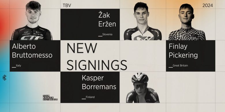 Les quatre jeunes coureurs ne sont pas tous dans le même cas de figure : l'Italien Alberto Bruttomesso a couru en 2023 au sein de l'équipe Cycling Team Friuli ASD, la structure U23 de développement liée à Bahrain Victorious. Il passera dès janvier prochain dans l'effectif de l'équipe professionnelle WorldTour. Même chose pour Finlay Pickering, qui a disputé cette dernière saison sous les couleurs de Trinity Racing et rejoindra dès l'année prochaine Bruttomesso aux côtés de coureurs comme Pello Bilbao, Matej Mohoric ou Mikel Landa.