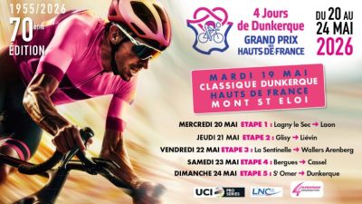 4 Jours de DunkerqueLa 70ᵉ édition des 4 Jours de Dunkerque se tiendra du 20 au 24 mai 2026, précédée le 19 mai par la Classique Dunkerque – Hauts-de-France, qui fera 199 km entre Dunkerque et le Mont-Saint-Éloi. La course à étapes partira elle de Lagny-le-Sec pour rejoindre Laon, avant des arrivées à Liévin, Wallers-Arenberg, Cassel et Dunkerque. La 3e étape comportera plusieurs secteurs pavés, pour un total de 23,2 km non asphaltés, avec un circuit final autour d’Haveluy. Le samedi, le peloton conclura au Mont Cassel par la sévère montée de la porte d’Aire (8,5 %). Le dimanche, les sprinteurs devraient se disputer la victoire finale à Dunkerque après un passage par le Mont des Cats et le Mont de Boeschepe.