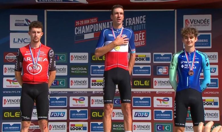 Championnats de FranceDisputé ce jeudi après-midi autour des Herbiers, en Vendée, le contre-la-montre Élite Hommes des Championnats de France a de nouveau consacré Bruno Armirail (Decathlon AG2R La Mondiale Team) ! Le tenant du titre et favori de cette édition 2025 a confirmé son statut d'actuel meilleur rouleur français du peloton en décrochant un troisième maillot bleu-blanc-rouge sur les quatres dernières années. En tête à tous les intermédiaires, le Pyrénéen a encore accéléré dans la deuxième partie plus vallonnée de ce parcours de 26,5 km pour s'imposer dans un temps de 32 minutes et 16 secondes. Comme l'an passé, Kévin Vauquelin (Arkéa-B&B Hotels) doit se contenter de la 2e place à 21 secondes, mais malgré ce bel écart, il pourrait encore nourrir des regrets car il a chuté en début de course, visiblement touché au niveau du coude et de la cuisse sur la ligne. Du haut de ses 18 ans, la pépite Paul Seixas (Decathlon AG2R La Mondiale) monte déjà sur son premier podium chez les Elites, à 44" de son coéquipier. Plus d'info à suivre...