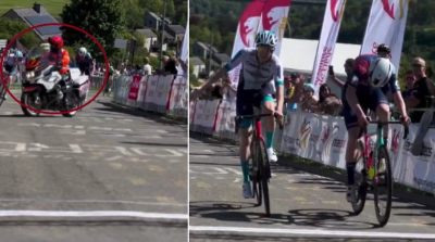 Liège-Bastogne-LiègeEn marge du Tour d'Italie, qui occupe logiquement tout l'espace médiatique depuis vendredi et le Grand Départ d'Albanie, une scène assez surréaliste et source de polémique a eu lieu ce samedi 10 mai à l'arrivée de Liège-Bastogne-Liège Juniors. A l'issue des 137.6 km de course, l'emblématique montée de La Redoute servait de juge de paix final à la 4e édition de l'épreuve U19, remportée l'an passé par le prodige Paul Seixas. Au coude-à-coude pour succéder au Français, le Britannique Harry Hudson et le Belge Leander De Gendt (Cannibal B Victorious) se jouaient la victoire lors d'un sprint final intense... jusqu'au moment où leur duel a été perturbé à quelques mètres de la ligne par une moto de police voulant se rabattre sur la droite pour prendre la dérivation ! Une manoeuvre inattendue qui a très clairement gêné Leander De Gendt et offert sur un plateau la victoire à Harry Hudson.