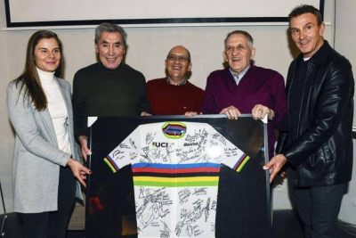 MédiaLe "fameux" journaliste belge Hugo Coorevits tire sa révérence en cette fin d'année 2024, et il a reçu un superbe cadeau d'adieu pour son 65e anniversaire. Quatre champions du monde, dont Eddy Merckx, ont remis un maillot arc-en-ciel unique à Hugo Coorevits en reconnaissance de sa remarquable carrière de journaliste cycliste. Ce maillot, signé par 34 champions du monde, dont Mathieu van der Poel, Julian Alaphilippe, Remco Evenepoel, Mark Cavendish ou encore Bernard Hinault, lui a été remis en main propre par trois des signataires : Eddy Merckx (champion du monde en 1967, 1971 et 1974), Freddy Maertens (1976 et 1981), Johan Museeuw (1996) et Lotte Kopecky (2023 et 2024).