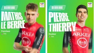 TransfertAprès la disparition d'Arkéa-B&B Hotels, certains coureurs cherchent encore un point de chute à quelques semaines du début de la saison sur route. Ce n'est plus le cas de Mathis Le Berre et Pierre Thierry qui rebondissent chez la Team TotalEnergies. Le Berre, vainqueur du Tour de Normandie 2022, aura à coeur d'exploiter ses qualités lorsque la route s'élève pour aller chercher sa première victoire WorldTour. Thierry espère lui avoir un environnement sain pour progresser dans les meilleurs conditions.