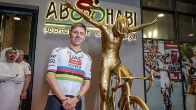 Lors de la traditionnelle fête de fin de saison de la formation émiratie, une imposante statue dorée de Pogacar a été inaugurée au club de cyclisme d’Abu Dhabi. L’œuvre représente le coureur en train d’exécuter l’une de ses célébrations emblématiques : une révérence sur la selle.