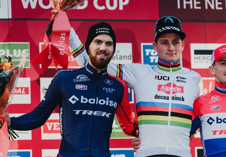 Cyclo-Cross - CDMLa dernière manche de Coupe du monde de cyclo-cross en 2023 a été marquée samedi par une nouvelle démonstration de Mathieu Van der Poel à Hulst, mais aussi par la très belle performance d'équipe de la Baloise Trek Lions, qui a placé trois de ses coureurs néerlandais derrière l'intouchable champion du monde. Et dans cette lutte entre coéquipier pour déterminer qui serait le meilleur du reste du monde, c'est Joris Nieuwenhuis qui a pris le dessus sur Lars Van Der Haar et Pim Ronhaar ! Le coureur de 27 ans a connu un vrai déclic cet hiver en remportant ses premières victoires au plus haut niveau, et confirme donc son excellente forme avec un 4e podium en Coupe du monde d'autant plus gratifiant qu'il a du surmonter un ennui mécanique en début de course. "J'ai eu une crevaison juste après la zone des stands. Il m'a donc fallu un certain temps avant de me lancer dans la course", a-t-il réagi en interview juste après l'arrivée.
