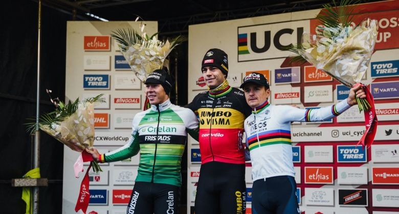 Cyclo-cross - CDMPour la première fois dans l'histoire de la Coupe du monde de cyclo-cross, une manche se déroulait ce dimanche à Dublin. Et après la victoire de Fem van Empel (Pauwels Sauzen-Bingoal) lors de la course Élite Femmes, c'est Wout Van Aert (Team Jumbo-Visma) qui a remporté celle des hommes ! À l'issue d'une épreuve disputée dans des conditions extrêmement froides et sur un circuit très boueux, le champion de Belgique a pris le dessus sur ses adversaires malgré une chute en début de course et un incident mécanique dans le 5e tour qui l'a obligé à faire demi-tour pour rejoindre le poste et lui a ainsi fait perdre de précieuses secondes. Revenu très rapidement sur les leaders, le coureur du Team Jumbo-Visma a ensuite déposé tout le monde dans l'avant-dernier tour pour aller signer sa première victoire de la saison, et ce dès sa deuxième course.