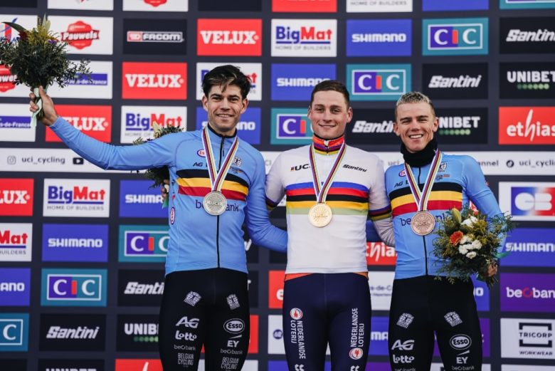 Championnats du MondeSi le Néerlandais Mathieu van der Poel a conservé avec autorité son titre de champion du monde ce dimanche à Liévin, les Belges n'ont pas été ridicules, avec la 2e place de Wout Van Aert mais surtout la 3e place de Thibau Nys, qui s'offre une place sur le podium malgré deux semaines de préparation compliquées. En effet, contraint de déclarer forfait le week-end dernier pour la dernière manche de Coupe du Monde à Hoogerheide, il n'a pas pu se préparer comme il le souhaitait à cause d'une maladie. Néanmoins, le Belge a quand même réussi à retrouver son meilleur niveau aujourd'hui, décrochant une belle médaille de bronze.