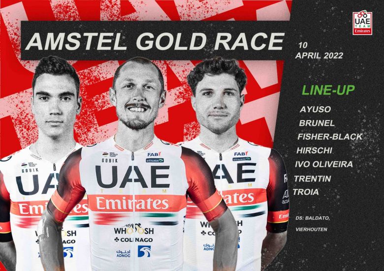 Amstel Gold RacePremière classique ardennaise du calendrier, l'Amstel Gold Race a troqué sa date avec Paris-Roubaix cette année, pour permettre aux Français d'aller voter à l'élection présidentielle sans rater l'Enfer du Nord, et se disputera donc le 10 avril. UAE Team Emirates sera l'une des équipes à surveiller sur ce parcours de 254 kilomètres, avec deux leaders : les jeunes Marc Hirschi et Juan Ayuso. Matteo Trentin sera également un équipier de choix aux côtés de ces deux coureurs qui, comme l'Italien, ont contribué au succès de leur équipe depuis le début de la saison.