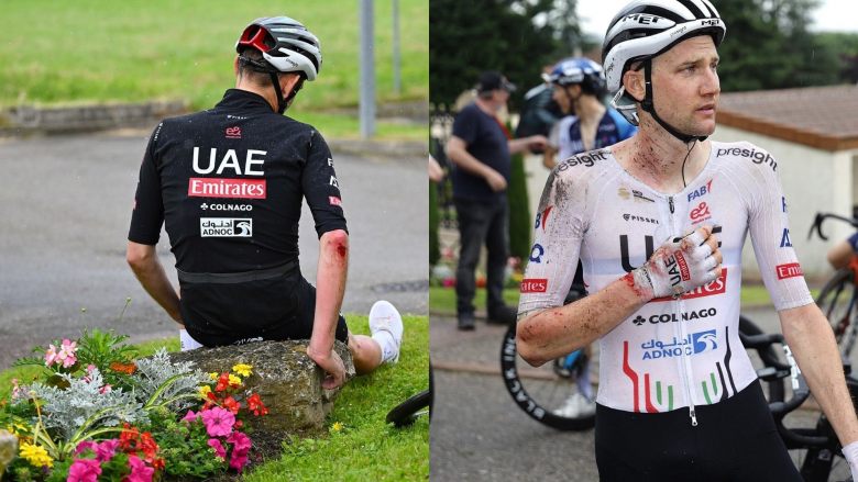 Critérium du DauphinéTrès impressionnante, la grosse chute collective survenue à 22 kilomètres de l'arrivée de la 5e étape du Critérium du Dauphiné a fait de nombreuses victimes. Au sein de l'équipe UAE Team Emirates, seul l'Espagnol Marc Soler n'est pas tombé. Le leader Juan Ayuso avait été aperçu dans le mal, aidé par Tim Wellens et un coureur de la formation Astana Qazaqstan à se relever. Le jeune Espagnol a été victime d'une "Lourde chute sur la hanche, le coude, le genou et la cheville gauches. Écorchures profondes à la hanche et au coude gauches. Pas de fractures manifestes. Pas de commotion cérébrale ni de blessure à la colonne vertébrale. Il sera raide et douloureux au cours des 3-4 prochains jours" selon le rapport médical de l'équipe.