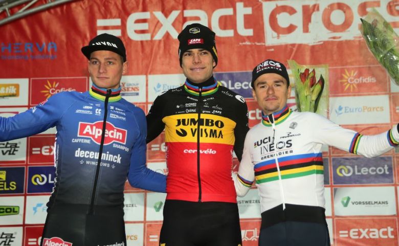 Exact CrossEt de cinq pour Wout Van Aert, décidément très en forme pendant cette faste période de Noël ! Le Belge de la Team Jumbo-Visma a encore démontré ce vendredi qu'il est bien l'homme fort de cette fin de saison 2022 de cyclo-cross - cinq succès et deux 2e places en sept courses - en remportant la 6e manche de l'Exact Cross, disputée dans la commune de Loenhout. Une victoire une nouvelle fois acquise au terme d'une immense bataille avec les deux autres monstres qui survolent la discipline, Mathieu van der Poel (Alpecin-Deceuninck) et Tom Pidcock (INEOS Grenadiers). Après avoir souffert face au Néerlandais et au Britannique, le champion de Belgique s'est accroché jusqu'au sprint final qu'il a brillamment enlevé en lançant de très loin. "C'était une course difficile pour moi", a confirmé Van Aert lors de l'interview d'arrivée.