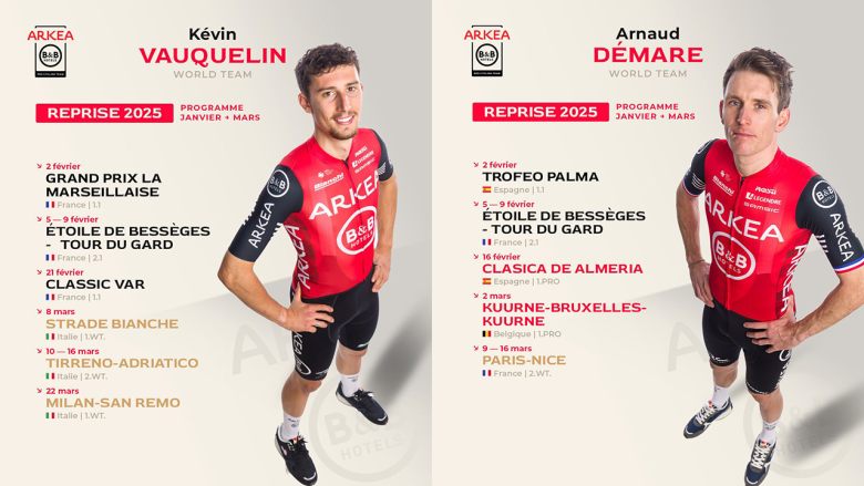 RouteCe lundi, la formation d'Emmanuel Hubert (Arkéa-B&B Hotels) a dévoilé le programme de début de saison de ses deux principaux leaders, à savoir Kévin Vauquelin et Arnaud Démare. Le vainqueur d'étape sur le Tour de France 2024, Kévin Vauquelin, conservera un programme presque identique à celui de 2024, à un détail près : il disputera pour la première fois de sa carrière la Milan-San Remo. Quant à Arnaud Démare, qui cherchera à atteindre le cap des 100 victoires chez les pros, il mixera son début de saison entre courses par étapes et épreuves d’un jour adaptées aux sprinteurs, telles que l'Étoile de Bessèges (5-9 février), Kuurne-Bruxelles-Kuurne (2 mars) ou encore Paris-Nice (9-16 mars).