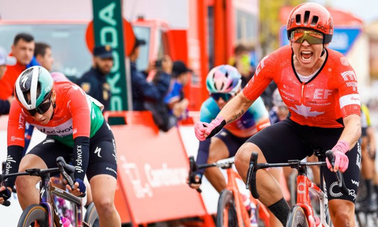 La Vuelta FemeninaAprès un chrono par équipe inaugural à suspense et plein de rebondissements, la 2e étape de La Vuelta Femenina by Carrefour.es a ce lundi accouché d'un premier sprint massif peu conventionnel, mouvementé et remporté par... Alison Jackson (EF Education-Cannondale) ! A l'issue d'un final chaotique marqué par plusieurs chutes sur des routes rendues glissantes par la pluie, le peloton est arrivé morcelé et totalement désorganisé pour la gagne. Et c'est la lauréate de Paris-Roubaix 2023 - loin d'être réputée pour ses qualités de pur sprinteuse - qui en a profité pour imposer sa puissance et décrocher à Moncofar sa première victoire sur un Grand Tour, à 35 ans. La championne du Canada devance Blanka Vas (Team SD Worx-Protime) et Karlijn Swinkels (UAE Team ADQ). Deuxième à l'arrivée mais aussi du sprint intermédiaire, la jeune Hongroise peut se consoler avec le gain du maillot Rouge grâce aux bonifications ! La nouvelle leader du général possède 8" sur la vainqueure du jour et 9" sur l'ancienne porteuse Gaia Realini (Lidl-Trek).