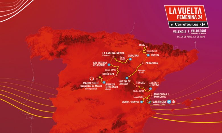 La Vuelta FemeninaLe parcours de La Vuelta Femenina by Carrefour.es 2024 a été dévoilé ! Et le programme de cette 2e édition, qui se déroulera du 28 avril au 5 mars, s'annonce alléchant. Les coureuses s'élanceront de Valence, avec un contre-la-montre par équipe de 16 kilomètres dans la ville côtière. Ensuite, les sprinteuses auront de quoi faire, avec trois étapes qui devraient se jouer lors d'arrivées groupées. La 2e partie de course sera bien plus difficile, avec trois arrivées au sommet. Ça commencera dès le 5e jour, avec l'arrivée à Jaca, puis le lendemain à La Laguna Negra. Les femmes rapides auront une dernière chance de briller sur la 7e étape, avant l'étape reine pour conclure cette édition 2024, avec les ascensions du Puerto de La Morcuera et de Valdesqui.