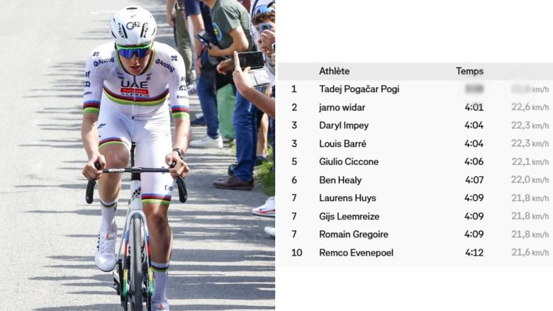 Pogacar a littéralement survolé la montée dimanche. Sans jamais se mettre en danseuse, il a atteint le sommet à une vitesse moyenne de 22,8 km/h. Le champion du monde a bouclé le segment visé (1,51 km à 10,5%) en 3 minutes et 58 secondes, soit trois secondes de mieux que Widar. Ce dernier avait battu, lors d’un entraînement le 1er octobre 2023, le précédent record détenu par Remco Evenepoel, établi pendant Liège-Bastogne-Liège 2023, en 4'12".