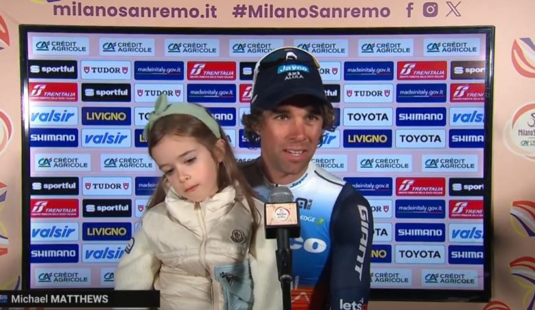 "Je ne pense pas avoir de regrets, je suis très fier de ma performance aujourd'hui. J'ai tout fait parfaitement, j'étais toujours bien positionné dans le final. L'équipe a fait un super travail, on a fait du mieux qu'on pouvait avec tous ces changements de dernière minute ces derniers jours. Je suis très content du résultat, même si évidemment, après être passé si proche de la victoire, c'est un peu dur à avaler et à accepter pour le moment. Mais je suis sûr que dès demain matin je serai fier de ma course", a expliqué Michael Matthews en interview d'après-course, avec sa fille sur les genoux pour le consoler. "Je me suis vu gagner... Je ne sais pas si on l'a vu à la caméra, mais à 50 mètres de la ligne, mes lunettes sont tombées, et j'ai raté un coup de pédale. C'est là que Philipsen est revenu. Mais on ne peut rien y faire désormais."
