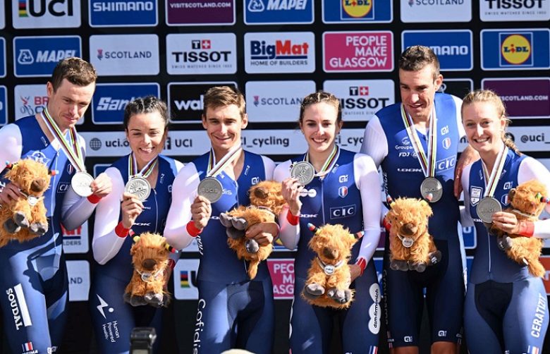 MondiauxLa France tient sa première médaille en relais mixte ! Jamais sur le podium depuis l'apparition, en 2019, de cette épreuve au programme des Championnats du monde, les Bleus ont pris la deuxième place ce mardi, à seulement 7 secondes de l'ultra-favorite équipe de Suisse, qui a tenu son rang mais a bien failli se faire dominer par un grand collectif français. Tandis que le trio masculin composé de Bruno Armirail, Rémi Cavagna et Bryan Coquard avait superbement bien lancé ce contre-la-montre en faisant le troisième temps, Audrey Cordon-Ragot, Cédrine Kerbaol et Juliette Labous ont réalisé un relais de folie pour passer devant l'Italie - qui a totalement craqué - et échoué donc sur les talons des Helvètes.