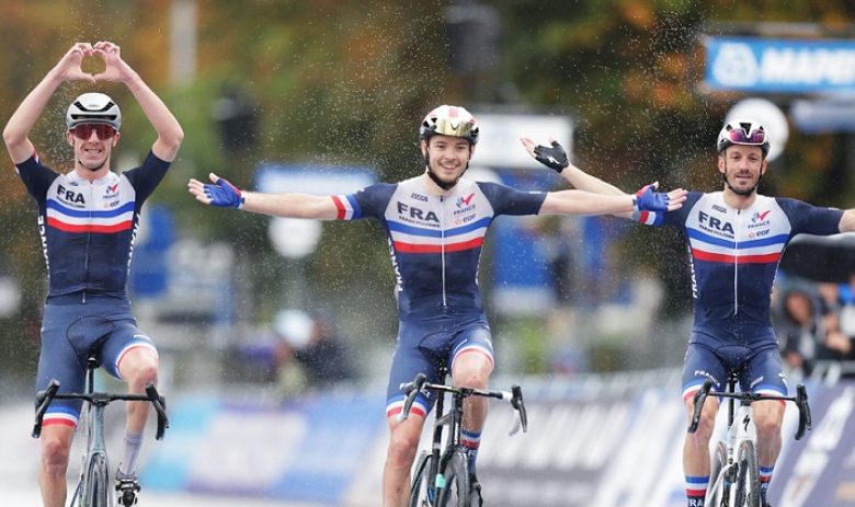 Restait à savoir s'ils allaient se jouer la victoire à la pédale ou s'ils allaient décider de l'ordre du podium, et c'est finalement la seconde solution qui a été retenue. Jamais sacré champion du monde sur la route, contrairement à Kévin Le Cunff (à droite sur la photo) et Mattis Lebeau (à gauche sur la photo), Gatien Le Rousseau a eu l'honneur de franchir la ligne d'arrivée en premier et endosse donc, à 21 ans, le maillot arc-en-ciel. Titré sur le chrono, Lebeau prend la deuxième place, tandis que Le Cunff, double tenant du titre, décroche la médaille de bronze. Ces trois breloques interviennent après les deux obtenues ce jeudi matin par Florian Jouanny, deuxième en H2, et Anaïs Vincent, troisième en H3.