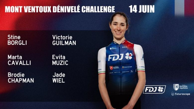 Mont Ventoux ChallengesLa FDJ Nouvelle-Aquitaine Futuroscope a dévoilé sur Twitter sa composition pour le Mont Ventoux Dénivelé Challenge. L'équipe n°2 au classement UCI a aligné en tête d'affiche la spécialiste des courses d'un jour Marta Cavalli, vainqueure cette saison de l'Amstel Gold Race et de la Flèche Wallonne, qui sera accompagnée de la Norvégienne Stine Borgli et des grimpeuses françaises Victorie Guilman et Evita Muzic. L'Italienne pourra également compter sur l'Australienne Brodie Chapman, ou encore sur la jeune Jade Wiel (22 ans), pour cette quatrième édition du Mont Ventoux Challenge, la première édition à inclure la course féminine. En revanche, la Danoise Cecilie Uttrup Ludwig ne fait pas partie du groupe, et l'équipe française devra compter notamment sur la formation Canyon//SRAM RAcing pour dynamiter la course. Il faudra se remobiliser après être passé tout près de la victoire sur le Women's Tour, finalement remporté par Elisa Longo Borghini (Trek-Segafredo).