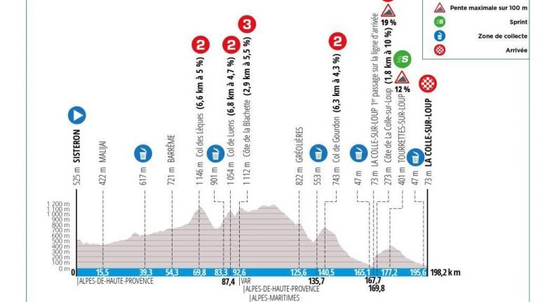 Avec 2475 mètres de dénivelé positif sur les 198 kilomètres du parcours entre Sisteron et la Colle-sur-Loup, les favoris pourraient se livrer une belle bataille. En-tout-cas, le final est propice à ce genre de scénario, avec la Côte de La Colle-sur-Loup (1,8km à 10%, pentes max à 19%) placée à 30 bornes de la ligne, suivie d'un long faux-plat montant emmenant jusqu'au sprint intermédiaire, avant d'une longue descente vers la commune de La Colle-sur-Loup.