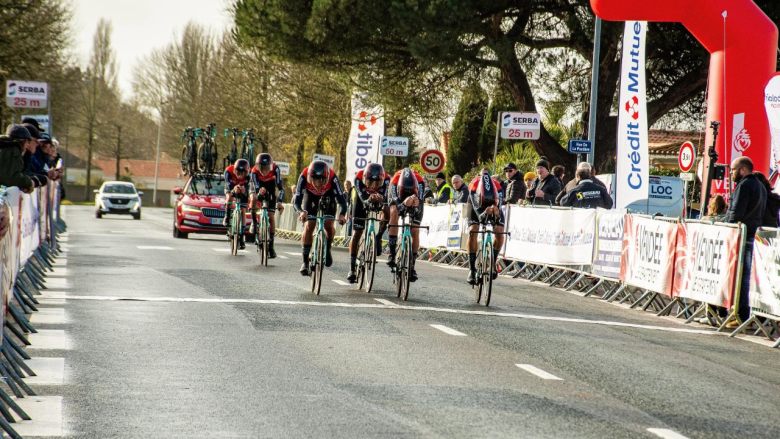 Plages VendéennesL'équipe de développement de la formation d'Arkéa-B&B Hotels a remporté ce samedi matin le contre-la-montre par équipes à Challans, qui faisait office de cinquième étape sur le Circuit des Plages Vendéennes (Élite Nationale). A l'issue des 27,5 kilomètres, la formation bretonne a devancé Vendée-U pour 37 secondes et le Team Adris-La Crêpe de Brocéliande-BLC pour 1'03''.
