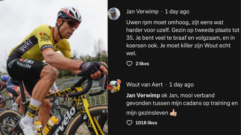 Dans les commentaires de cette sortie, l’utilisateur a écrit : "Tu dois augmenter ta cadence de pédalage. Et la vie de famille doit passer en deuxième position jusqu’à 35 ans. Tu es trop bien élevé, trop docile. Tu dois devenir un tueur, Wout, vraiment." Ce à quoi Wout van Aert s’est empressé de répondre : "OK Jan, quel est le lien entre ma cadence de pédalage à l’entraînement et ma vie de famille ?" Un commentaire qui a été énormément liké et apprécié par les utilisateurs qui soutiennent Wout van Aert sur la plateforme Strava.