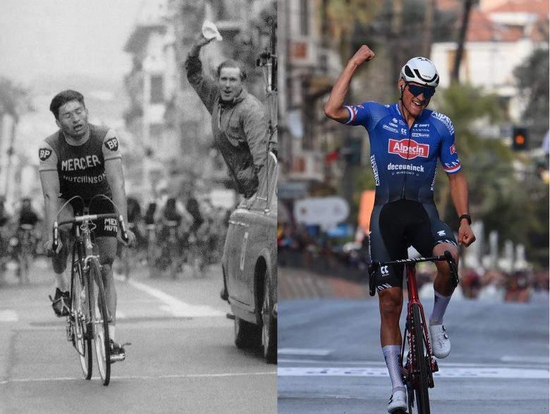 Le peloton, emmené par la Faema de Rik Van Looy fond sur notre héros malheureux. Le Keizer d'Herentals lance son sprint et revient comme un boulet de canon sur Raymond Poulidor. Mais, cette fois-là, la poisse n'aura pas raison du coureur de Mercier. Il conservera une minuscule avance de 3 secondes sur le peloton et peut savourer l'un de ses plus beaux succès. Raymond Poulidor, un coureur avec lequel il faudra compter durant plus de 15 ans dans le peloton professionnel. Un grand champion, bien trop souvent malheureux et victime de malchance. Mais c'est sans doute cela qui l'aura rendu si populaire aux yeux du grand public. Milan - San Remo restera le seul monument qu'il accrochera dans sa carrière, ses objectifs étant bien (trop?) souvent uniquement fixés sur les courses par étapes. Un problème dont n'est pas victime son petit-fils, Mathieu van der Poel (Alpecin - Deceuninck), déjà vainqueur du Tour des Flandres et de Paris - Roubaix, et qui a bouclé la boucle la saison dernière en remportant son premier Milan - San Remo, également en solo sur la Via Roma, comme son illustre aïeul 62 ans avant lui.