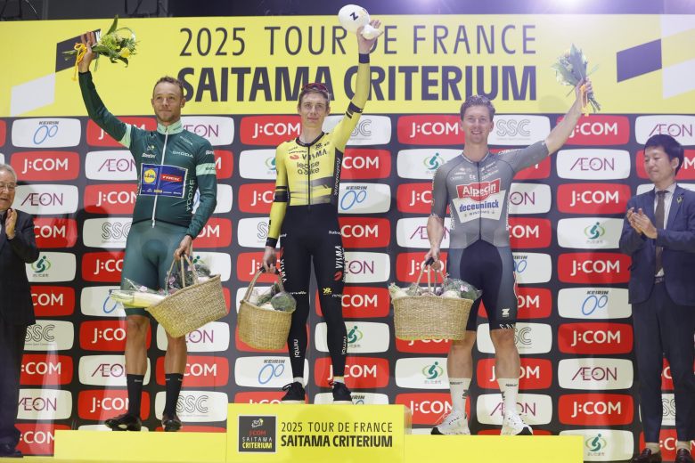 Saitama CritériumIl fallait se lever assez tôt pour suivre ce dimanche 9 novembre la onzième édition du Tour de France J:Com Saitama Critérium. Autour d’un circuit dans la ville voisine de Tokyo, 21 coureurs du Tour de France, dont plusieurs vainqueurs d’étapes, ainsi qu’une sélection effectuée parmi les meilleures équipes du Japon, se disputaient la victoire sur cette édition 2025. Et c’est un homme en solitaire qui s’est imposé, en la personne du double vainqueur de la Grande Boucle, le Danois Jonas Vingegaard (Team Visma | Lease a Bike), qui a résisté au retour des hommes rapides à l’arrière (malgré une chute à 15km de l’arrivée, il a pu revenir sur les coureurs et les lâcher à 2km de l’arrivée) où Jonathan Milan (Lidl-Trek) a pris le dessus sur l’Australien Kaden Groves (Alpecin-Deceuninck).