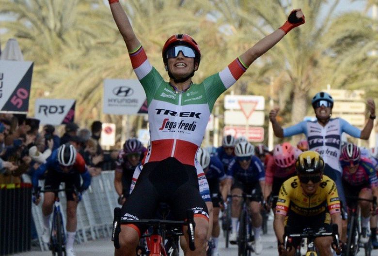 Semaine ValencienneTop départ pour la 7e édition de la Semaine Cycliste Valencienne ! Avant les étapes décisives pour le classement général qui auront lieu ce week-end, les deux premières journées sont propices à un sprint massif, à commencer par celle de jeudi qui s'est disputée entre Valence et Sagunt. Et au terme des 119 kilomètres, d'une étape inaugurale calme et sans problème pour les principales favorites, c'est l'ancienne championne du monde Elisa Balsamo (Trek-Segafredo) qui a levé les bras. La sprinteuse italienne, qui faisait son retour à la compétition, décroche ainsi la première victoire de sa saison en faisant parler sa pointe de vitesse dans les derniers mètres. Celle qui prend la tête du classement général s'impose devant Lotta Henttala (AG Insurance-Soudal Quick Step) et Coryn Labecki (Team Jumbo-Visma).