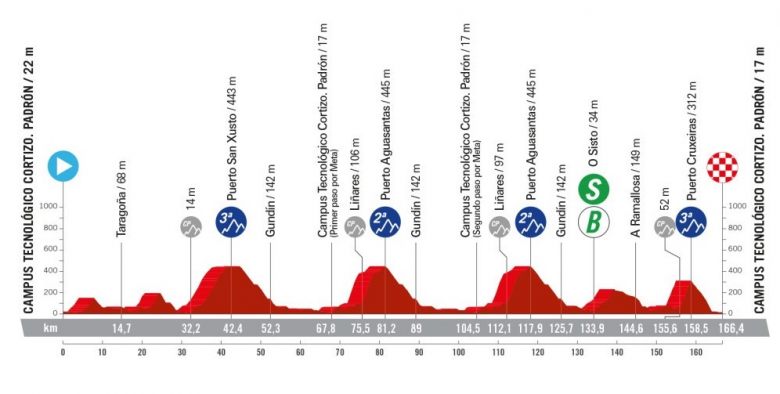 Tour d'EspagneTracée en larges circuits autour de la ville de Padron et de son Campus Technologique Cortizo, cette 11e étape du Tour d'Espagne s'annonce à nouveau indécise et très ouverte. Moins difficile que la veille, le parcours propose quatre ascensions de 3e et 2e catégorie réparties de manière régulière tous les 40 kilomètres environ, mais c'est bien la dernière d'entre elle, le Puerto Cruxeiras, qui servira de juge de paix ce mercredi pour la victoire d'étape. Avec une pente moyenne de presque 9% sur près de trois kilomètres et un sommet situé à seulement 8 bornes de l'arrivée, cette montée explosive devrait permettre à un coureur en forme et bon puncheur de s'imposer.
