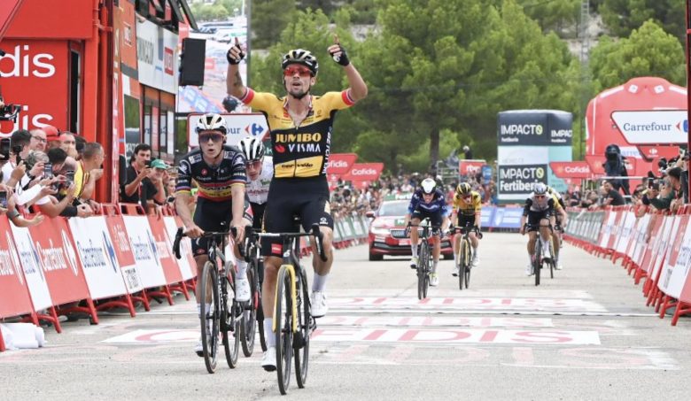 Ces 8 coureurs basculent ensemble au sommet, il reste désormais une petite descente, avant une légère remonté. La victoire va donc se jouer au sprint, et c'est Remco Evenepoel qui lance le premier, mais il est devancé par un impressionnant Primoz Roglic dans les 150 derniers mètres. Le Slovène vient donc chercher sa 7e victoire d'étape sur La Vuelta. Il devance Remco Evenepoel (Soudal Quick-Step) et Juan Ayuso (UAE Team Emirates). Ayant pris une petite cassure dans le sprint, Enric Mas (Movistar Team), Jonas Vingegaard (Jumbo-Visma), Joao Almeida (UAE Team Emirates), Sepp Kuss (Jumbo-Visma) et Marc Soler (UAE Team Emirates) terminent à deux petites secondes. Ayant finalement très bien géré le final, Lenny Martinez finit à la 13e place à 1'10" du Slovène, mais doit laisser son maillot rouge à Sepp Kuss.