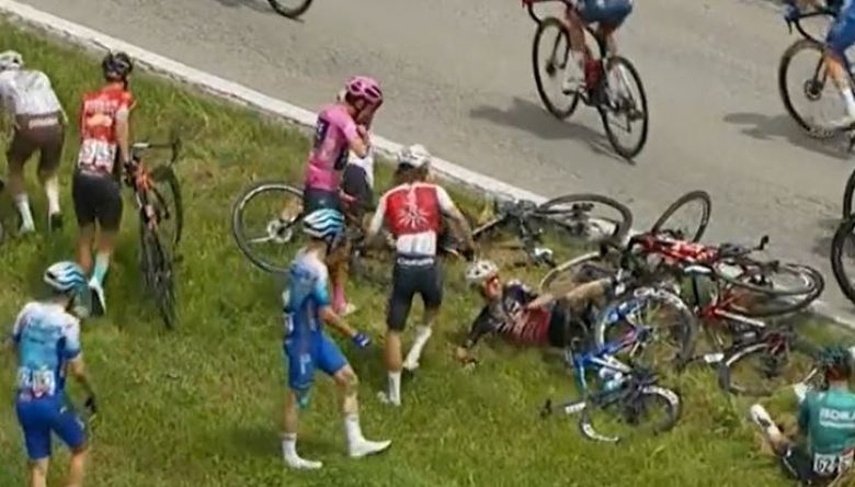 Richard Carapaz n'a pas commencé sa campagne en rose de la meilleure des manières... Le leader du Tour d'Italie a en effet chuté ce dimanche midi peu après le départ de la 15e étape. Tombé dans l'herbe en compagnie d'autres coureurs, l'Équatorien ne s'est apparemment pas fait mal et est reparti quelques secondes après cet incident. Guillaume Martin (Cofidis), Simon Yates (Team BikeExchange-Jayco), Jaakko Hänninen (AG2R Citroën Team) et Giovanni Aleotti (BORA-hansgrohe) - entre autres - ont également été impliqués dans cette chute survenue après 6 kilomètres de course.