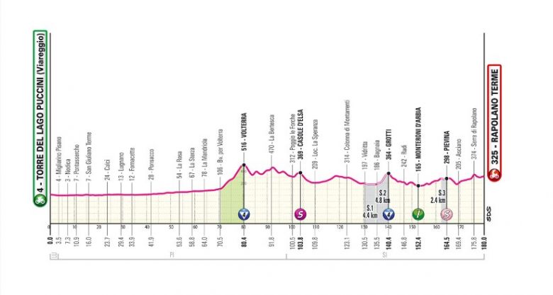 Tour d'ItalieAttention à la 6e étape du Tour d'Italie ! Si le profil est loin d'être effrayant, il en va autrement des trois chemins empierrés (dont deux apparaissant sur le parcours des Strade Bianche) que va devoir emprunter le peloton durant les 180 kilomètres à parcourir entre Viareggio et Rapolano Terme). D'une longueur de 11,6 bornes, la partie non asphaltée de cette 6e étape du Giro fera assurément des dégâts et pourrait faire perdre leurs illusions à quelques coureurs visant un bon classement général final. Les 5 derniers kilomètres de cette étape seront particulièrement corsées, avec la montée de Serre di Rapolano (1,2 km à 8,4%, avec un passage à 20%) puis la ligne droite finale de 450 mètres à environ 6% de pente moyenne.