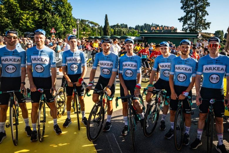 Tour de FrancePetite surprise pour tous les spectateurs et téléspectateurs qui suivent la présentation des équipes et des coureurs du Tour de France à Florence. Son tour venu, l'équipe Arkéa-B&B Hôtels ne s'est pas présentée sur scène avec ses traditionnelles couleurs rouges, mais avec un maillot collector et totalement différent ! Pour rendre hommage à son sponsor italien Bianchi à domicile, la formation bretonne a gardé le secret jusqu'au dernier moment sur ce petit clin d'oeil, arborant ainsi une tunique bleu ciel avec une bande blanche horizontale sur le torse, soit les couleurs de la marque transalpine. Que les fans de la structure française se rassurent, les huit coureurs porteront toutefois leur kit habituel pour les trois semaines de course à venir.