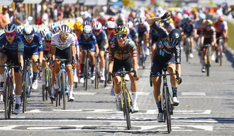 Tour de France FemmesElle était la grande favorite du jour et elle ne s'est pas manquée ! Lorena Wiebes (Team DSM) a remporté ce dimanche, sur les Champs-Élysées, la 1ère étape du Tour de France Femmes avec Zwift, devenant ainsi la première femme de l'Histoire à porter le maillot jaune sur cette toute nouvelle épreuve. Tout en puissance, la sprinteuse néerlandaise - victorieuse pour la seizième fois de la saison ! - a devancé sa compatriote Marianne Vos (Team Jumbo-Visma) et la Belge Lotte Kopecky (Team SD Worx). L'Italienne Rachele Barbieri (Liv Racing Xstra) et la Danoise Emma Norsgaard (Movistar Team) ont complété le top 5 du jour. Si Lorena Wiebes a assumé son statut, l'Italienne Elisa Balsamo (TrekSegafredo) a en revanche déçu, la championne du monde n'ayant pris que la septième place.