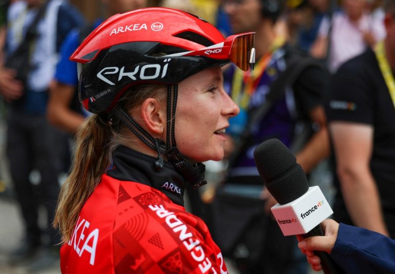 Tour de France FemmesLes Françaises continuent de briller sur cette 3e édition du Tour de France Femmes avec Zwift. Et si l'on attendait logiquement les meilleures grimpeuses tricolores sur cette 7e étape arrivant au Grand Bornand, la première en montagne, ce n'est ni Cédrine Kerbaol (Ceratizit-WNT Pro Cycling), ni Juliette Labous (Team dsm-firmenich PostNL), ni Evita Muzic (FDJ-SUEZ) qui ont fini sur le podium sur la ligne d'arrivée ce samedi, mais bien Maëva Squiban ! Peu en vue jusqu'ici cette semaine, la jeune Bretonne de l'équipe Arkéa-B&B Hotels a signé la plus belle performance de sa carrière en prenant la 2e place derrière la vainqueure du jour Justine Ghekiere (AG Insurance-Soudal). Opportuniste dans l’ascension finale pour s'extraire d'un peloton maillot jaune attentiste, la Finistérienne a tenu bon et impressionné pour résister jusqu'au bout au retour des favorites, offrant ainsi à la structure bretonne le premier podium de son histoire sur le Tour de France.