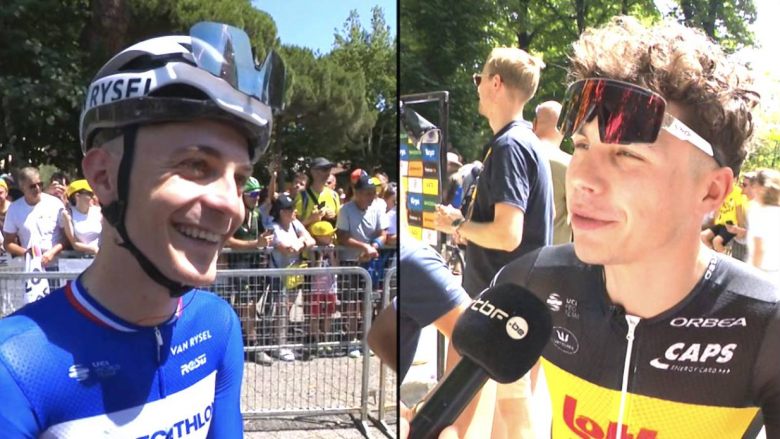 Tour de FranceSacrés respectivement champions de France et de Belgique, Paul Lapeira et Arnaud De Lie se sont prêtés au petit jeu des pronostics avant le match de football entre la France et la Belgique qui aura lieu ce lundi à 18h, à l'occasion des huitièmes de finale de l'Euro 2024. "Les 2 équipes n’ont pas forcément hyper bien joué jusque maintenant" déclare le coureur de la formation Decathlon AG2R La Mondiale auprès de nos confrères de la RTBF. "Je pense que ça va être serré quand même. Je vais dire 2-1 pour la France". De son côté, le coureur de l’équipe Lotto-Dstny "espère que la Belgique va faire honneur à ses couleurs. J’espère une victoire".