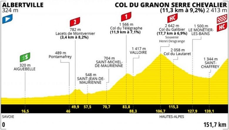 Mercredi 13 juillet - Étape 11 : Albertville - Col du Granon, 151,7 km (départ réel à 12h30, arrivée vers 16h55)