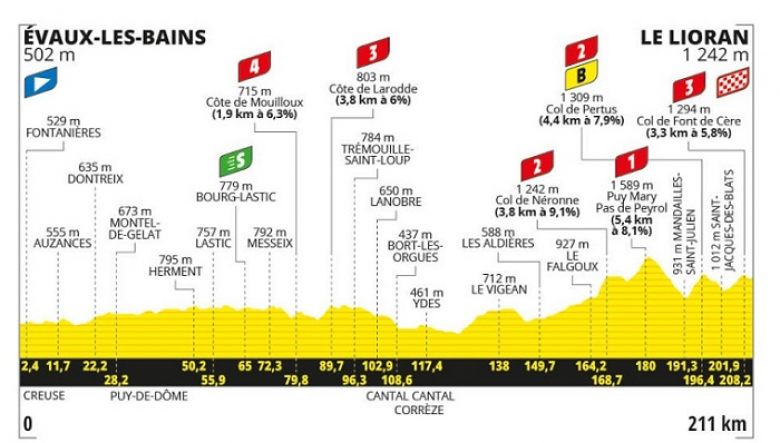 Tour de FrancePas de Vosges et de Jura cette année sur le Tour de France, mais du Massif Central, emprunté mercredi lors d'une 11e étape qui pourrait réserver quelques surprises et ne sera surtout pas à prendre par-dessus la jambe pour les leaders du classement général. Entre Évaux-les-Bains et le Lioran, ce sont 211 kilomètres et 4 350 mètres de dénivelé positif qui seront au programme, avec les plus grosses difficultés situées dans les 50 dernières bornes. Col de Néronne (3,8 km à 9,1%), Pas de Peyrol (5,4 km à 8%), col de Pertus (4,4 km à 7,9%) et col de Font de Cère (3,3 km à 5,8%) : les difficultés vont s'enchaîner, ne laissant aucun répit aux acteurs de la Grande Boucle.