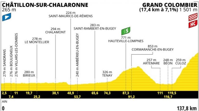 - Vendredi 14 juillet - Étape 13 : Châtillon-sur-Chalaronne - Grand Colombier, 137,8 km (départ à 13h55, arrivée vers 17h20)