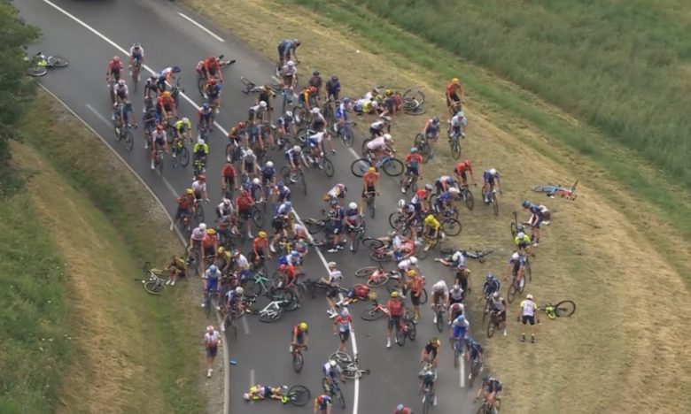 Tour de FranceAlors que cette 14e étape du Tour de France venait à peine de débuter, une grosse chute a ébranlé le peloton. Il s'agit là de la première chute massive de cette 110e édition. De nombreux coureurs sont allés à terre. Par conséquent, la course a été arrêtée par l'organisateur, en attendant que les blessés soient soignés et que les coureurs gênés puissent réintégrer le peloton. Parmi les coureurs qui ont chuté, on peut noter Wilco Kelderman (Jumbo-Visma), Vegard Stake Laengen (UAE Team Emirates), Clément Berthet (AG2R Citroën), Bryan Coquard (Cofidis) ou encore Tom Pidcock (INEOS Grenadiers), qui ont vite pu se relever. En revanche Antonio Pedrero (Movistar Team) et surtout Louis Meintjes (Intermarché-Circus-Wanty), 13e du classement général, ont été contraint à l'abandon. Après 28 minutes d'arrêt, la course est finalement repartie, après deux kilomètres de départ neutralisé.