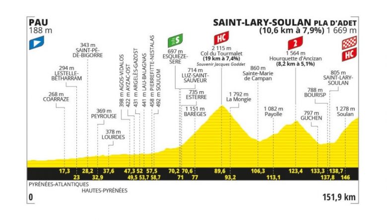 Saint-Lary-Soulan Pla d'Adet (sommet au km 151,9 / hors catégorie) : 10,6 km à 7,9%