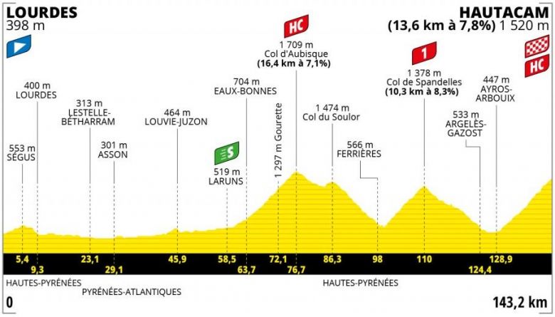 Jeudi 21 juillet - Étape 18 : Lourdes - Hautacam, 143,2 km (départ réel à 13h40, arrivée vers 17h40)