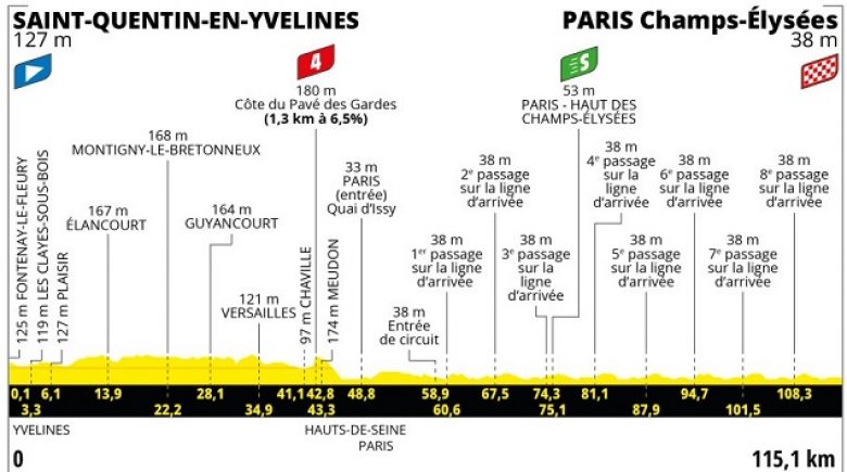 - Dimanche 23 juillet - Étape 21 : Vélodrome National de Saint-Quentin-en-Yvelines - Paris Champs-Elysées, 115,1 km (départ réel à 16h40, arrivée vers 19h35)