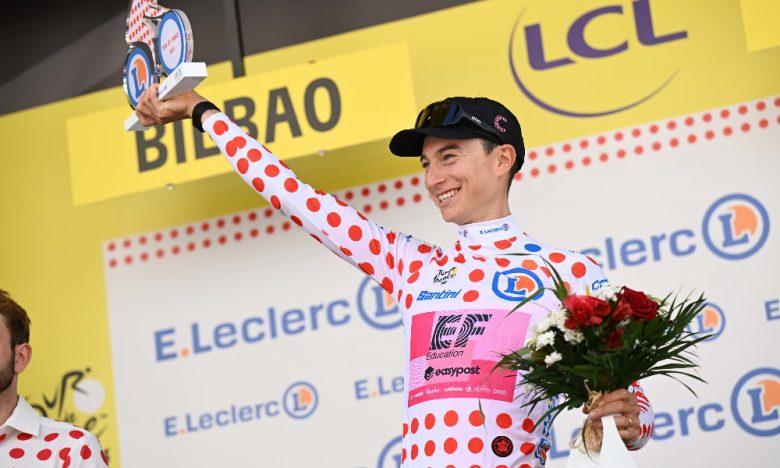Tour de FranceLa 1ère étape de ce 110e Tour de France a été un véritable cauchemar pour la formation EF Education-EasyPost ! Avec la chute de leur leader Richard Carapaz - qui est non-partant sur la 2e étape - les hommes de Jonathan Vaughters auraient rêvé d'un bien meilleur début de Tour. Seul point positif dans cette première journée bien difficile, Neilson Powless a été chercher le maillot à pois. Sans partir dans l'échappée matinale, l'Américain a pris les 5 points au sommet de la Côte de Vivero et se retrouve donc en tête du classement de la montagne. "J’ai grandi en regardant le Tour de France, et donc en voyant le maillot à pois rouler à l’avant de la course", explique Powless à l'arrivée. "Maintenant, je vais porter ce maillot, je réalise un rêve d’enfant. Je savais que c’était possible, mais il faut rassembler tous les ingrédients pour y arriver. Il fallait que l’échappée soit reprise avant la côte de Vivero, et ensuite que je puisse me placer en bonne position pour disputer le sprint au sommet."