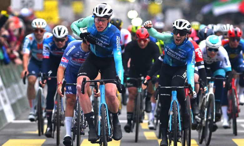 Alors que ça frotte dans les derniers kilomètres de cette 1ère étape, qui va donc se jouer au sprint. Le placement est primordial dans ce sprint en faux-plat descendant et c'est les Decathlon AG2R La Mondiale qui prennent le meilleur, puisque Dorian Godon est en première position aux 200 mètres, bien suivi par Andrea Vendrame. Alors qu'on attend que l'Italien dépasse le Français, celui-ci est très costaud et garde la tête. Impressionnant, Godon vient chercher la victoire devant son coéquipier. Une véritable démonstration ! Derrière, Gianni Vermeersch (Alpecin-Deceuninck), Milan Menten (Lotto Dstny) et Kasper Asgreen (Soudal Quick-Step) complètent le top 5 du jour. Une journée parfaite pour la formation Decathlon AG2R La Mondiale, puisque Godon s'empare également du maillot jaune de leader, grâce aux bonifications attribuées à l'arrivée. Il devance désormais Vermeersch et Alaphilippe de 6 et 9 secondes.