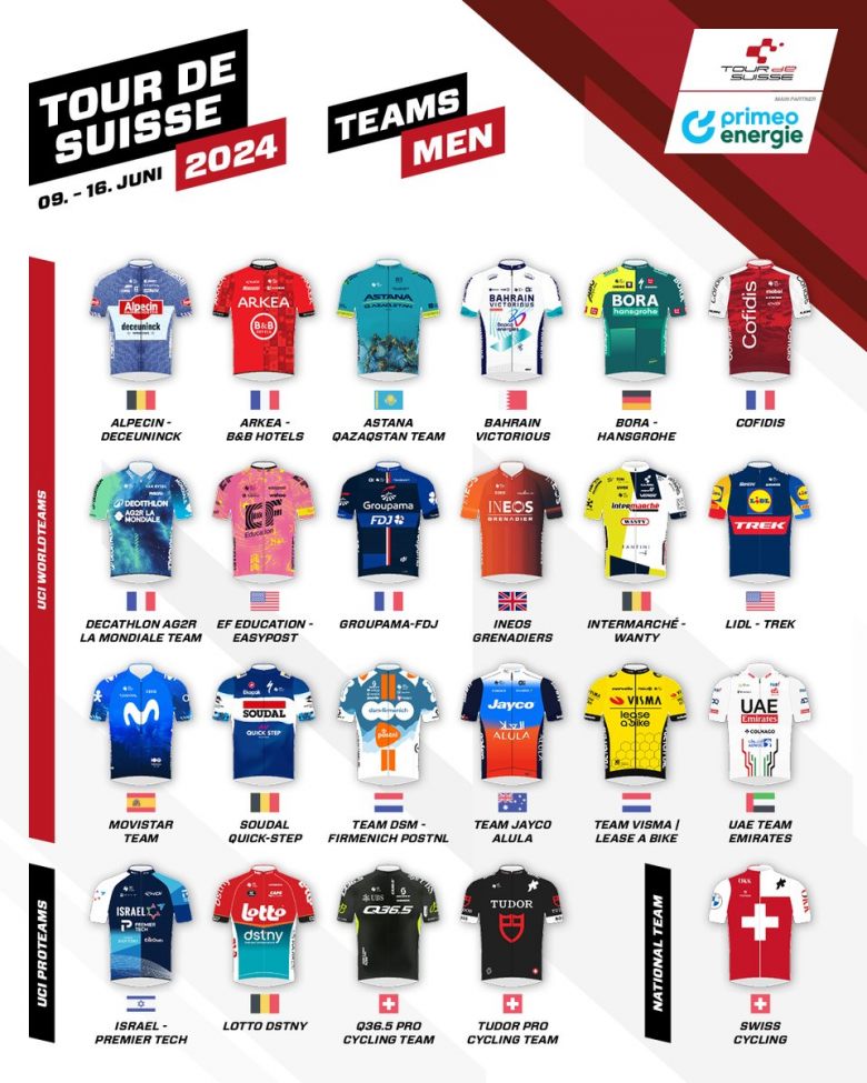 Tour de SuisseLe plateau du Tour de Suisse 2024 est désormais connu ! Après avoir révélé il y a quelques semaines toutes les villes-étapes de la 87e édition, qui se tiendra du 9 au 16 juin prochain, les organisateurs ont annoncé ce lundi le nom des 23 équipes qui prendront le départ depuis Vaduz, la capitale du Liechtenstein, pour se rendre jusqu'à Villars-sur-Ollon. En plus des dix-huit WorldTeams et des deux ProTeams automatiquement invitées, à savoir Israel-Premier Tech et Lotto Dstny, trois wildcards ont été distribuées. Sans surprise et comme l'an passé, les deux meilleures ProTeams suisses Tudor Pro Cycling Team et Q36.5 Pro Cycling Team seront préentes. En revanche, la Team TotalEnergies n'a pas été réinvitée cette année (comme souvent ces dernières semaines), la sélection nationale helvète lui étant préférée.